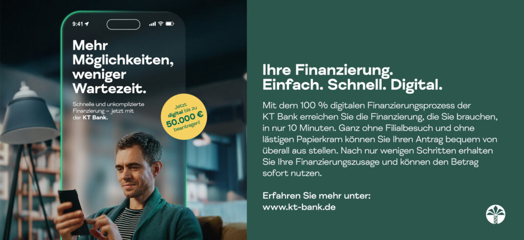 Mit dem neuen digitalen Finanzierungsprozess setzt die KT Bank einen Meilenstein im modernen Banking. Der Antrag kann bequem von zu Hause oder unterwegs über die Website der KT Bank gestellt werden. Lange Wartezeiten und umständliche Papierarbeiten gehören damit der Vergangenheit an. Dank des neuen Systems ist die Antragstellung jederzeit möglich – 24/7, an 365 Tagen im Jahr. So wird der Zugang zu Finanzierungsdienstleistungen noch flexibler, schneller und einfacher.