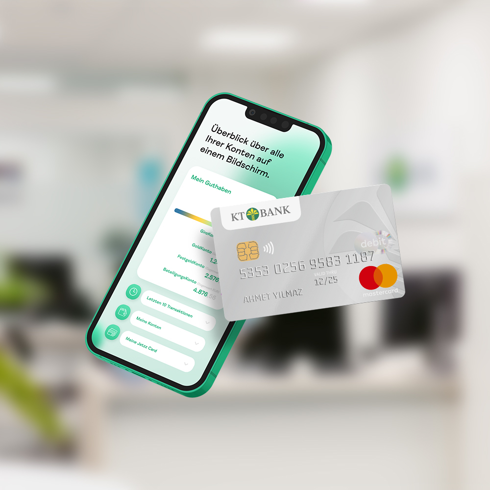 Mit deinem KT Konto hast du alle Spar- und Investmentoptionen direkt zur Hand: Spare systematisch, sichere dein Vermögen oder investiere digital in physisches Gold über das KT GoldKonto. Schon ab kleinen Beträgen steuerst du Kauf und Verkauf einfach per App oder Online-Banking. So kombinierst du Tagesgeschäft mit strategischem Vermögensaufbau – alles in einer modernen Banking-App.