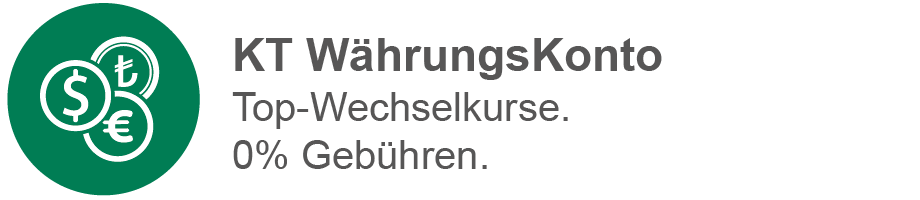 Vous êtes intéressé par des opérations de change rentables et variées? Grâce au compte KT de devises, nous vous proposons des taux de change avantageux, avec lesquels vous achetez par exemple une devise étrangère et vendez des euros, ou achetez des euros et vendez une devise étrangère. Les deux transactions sont réalisées à la KT Bank, entre votre compte courant en euros et votre compte KT de devises.