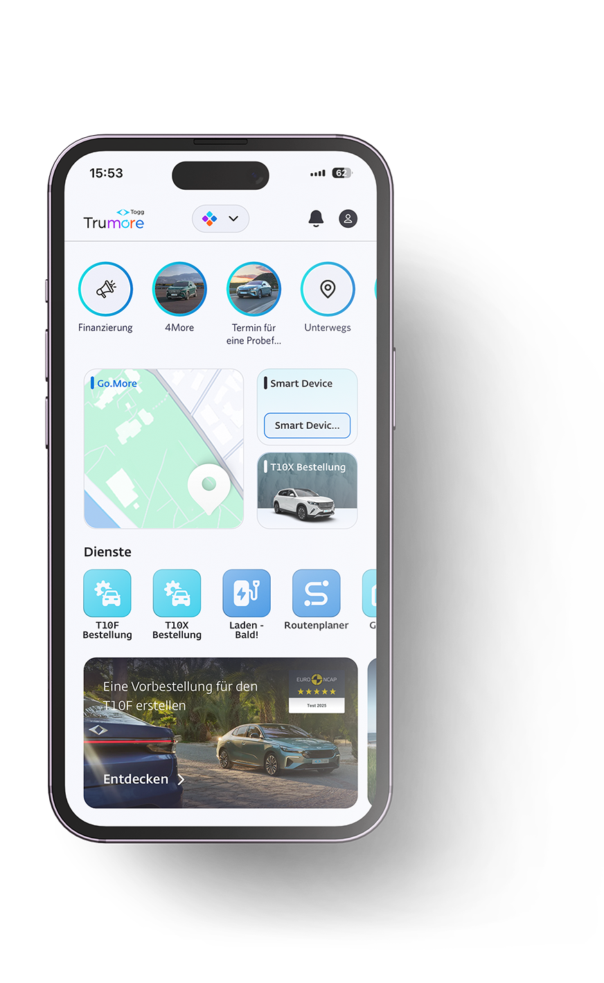 Mit der Trumore App erleben Sie Mobilität neu – und können Ihre Togg FahrzeugFinanzierung direkt digital beantragen. Ob vom Smartphone oder Tablet: In nur wenigen Minuten erhalten Sie Ihre Vorabgenehmigung über das Finanzierungsportal der KT Bank – schnell, sicher und komplett papierlos.
